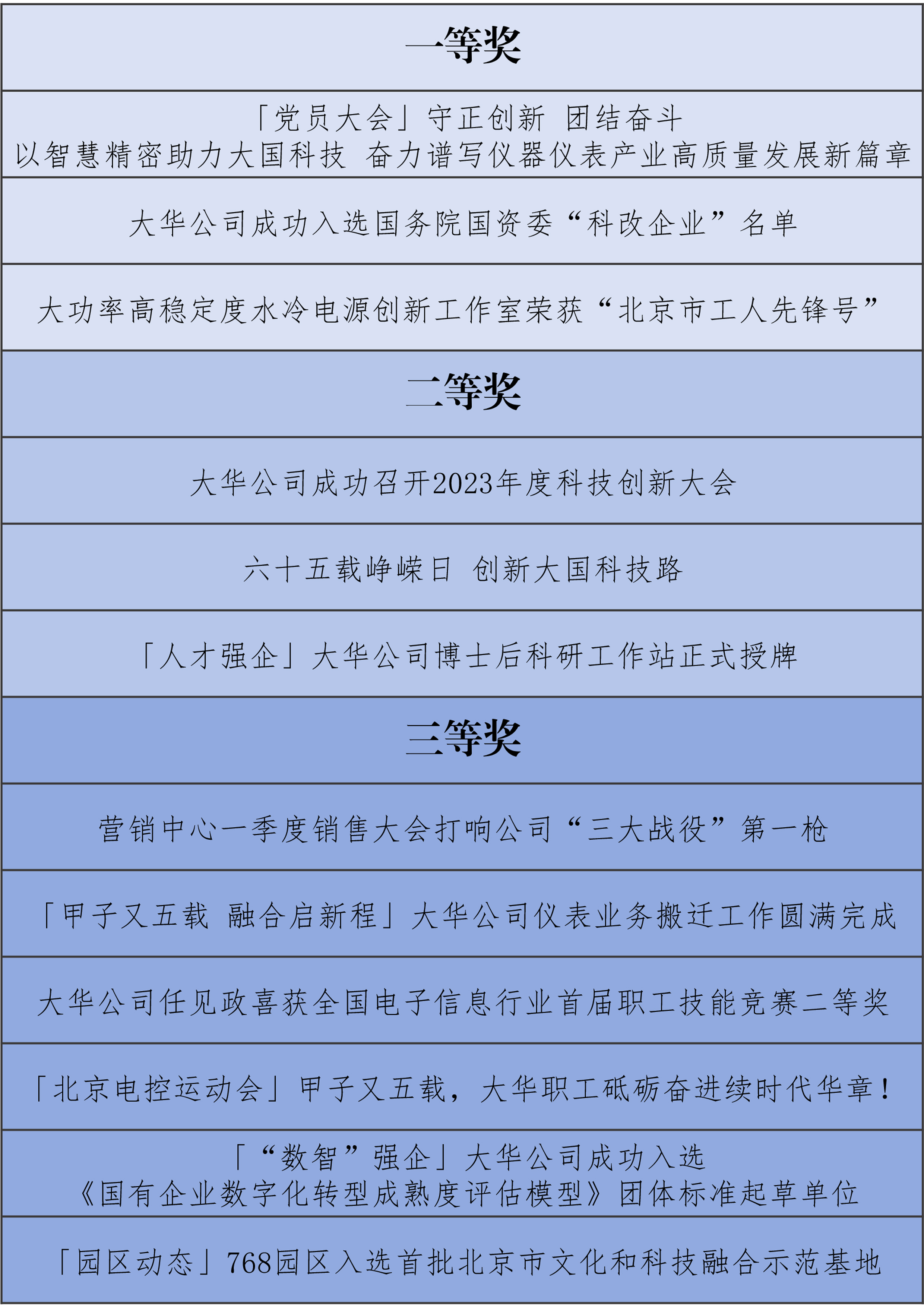 本次會議還對大華公司2023-2024年度好新聞進行了頒獎。大華公司年度好新聞評選,側(cè)重在改革創(chuàng)新、經(jīng)營管理、科技研發(fā)、市場開拓、生產(chǎn)制造、精神文化、黨的建設(shè)等各領(lǐng)域的優(yōu)秀成果、先進事跡及基層一線典型報道。作品導(dǎo)向正確、內(nèi)容真實、新聞性強,旨在發(fā)揮新時期宣傳思想文化工作作用,助力年度重點任務(wù)和各項目標(biāo)高質(zhì)量完成。公司黨委書記、董事長董永生,黨委副書記、紀(jì)委書記、工會主席李廣南,黨委委員、財務(wù)總監(jiān)、總法律顧問邵楠分別為12件優(yōu)秀作品頒發(fā)一、二、三等獎證書。